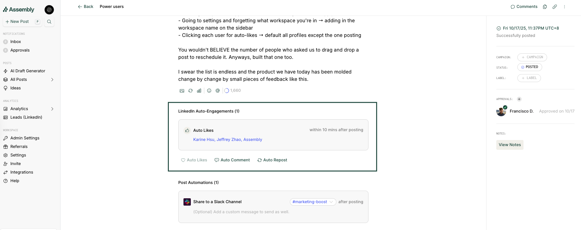 Drive visibility without manual effort. Assembly’s smart automation helps your team engage with company and employee posts instantly - boosting impressions and reach while maintaining a natural, human rhythm.