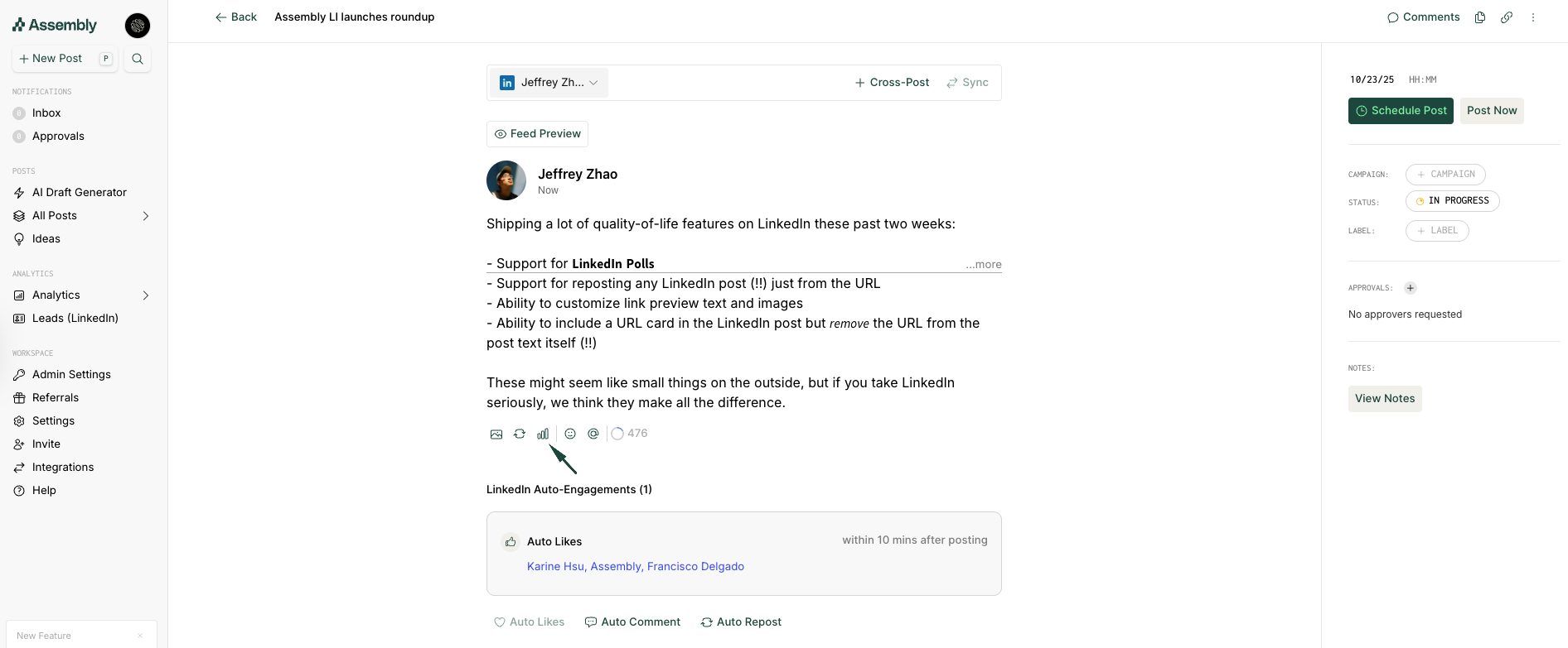 Assembly brings publishing, analytics, and collaboration together in one streamlined platform. While it supports multiple social networks, it’s especially effective for teams investing in LinkedIn - offering advanced features like tagging, polls, and engagement insights that most schedulers don’t have.